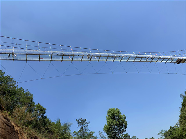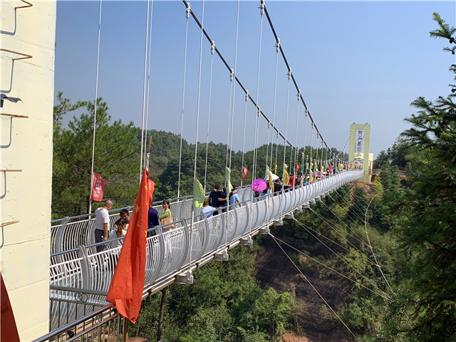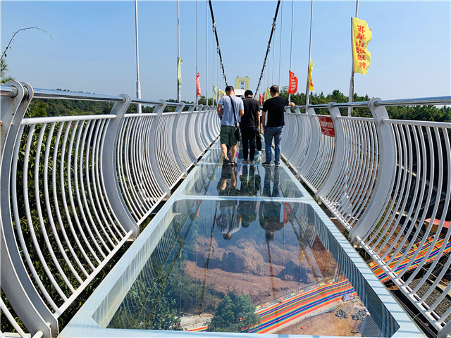 去年5月,花果山景区的新景点——玻璃桥正式开放,是衡阳市目前唯一的一座玻璃悬索桥,桥面宽1.5米,长约168米,最高处海拔60米。其最大的特点就是加入了7D效果,人踩上去有玻璃破碎的声光效果。