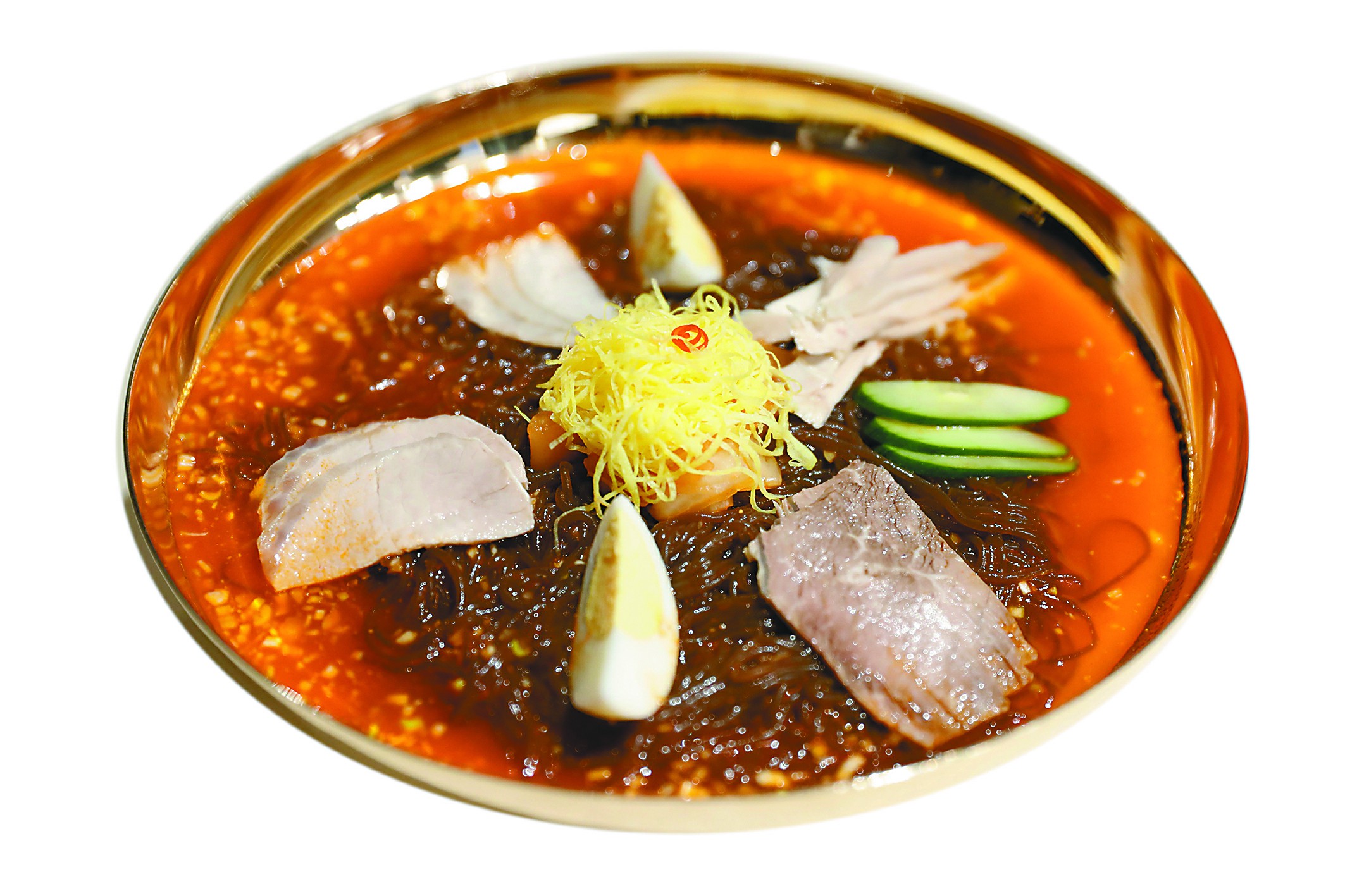 冷面的每道工序都非常讲究,制作工艺有严格标准。平壤冷面以荞麦粉为原料,面条呈现深栗色。而且最好是现和面、现压面条,醒面时间要精确控制,这样煮出的面条才更筋道。面条煮熟后要用凉开水进行冷却,挽成一团放入黄铜碗中。配卤的浇头一般有切成薄片的熟牛肉,再加上泡菜、切成片状的黄瓜和梨等,全部整齐有序地码放在面条之上,旁边配以切开的煮鸡蛋,最后倒入冷的萝卜泡菜汤或牛肉熬制的高汤。朝鲜人吃冷面也很有仪式感,先用金属筷子慢慢将浇头和面搅拌均匀,吃的时候先吃鸡蛋,据说这样对胃肠有保护作用。吃完面后人们多数会捧起碗将清凉酸爽的汤也喝干净。