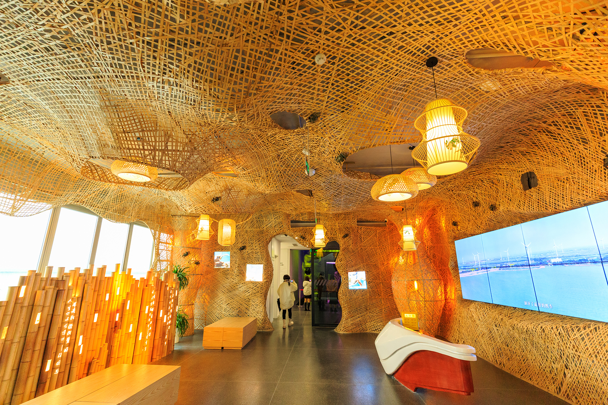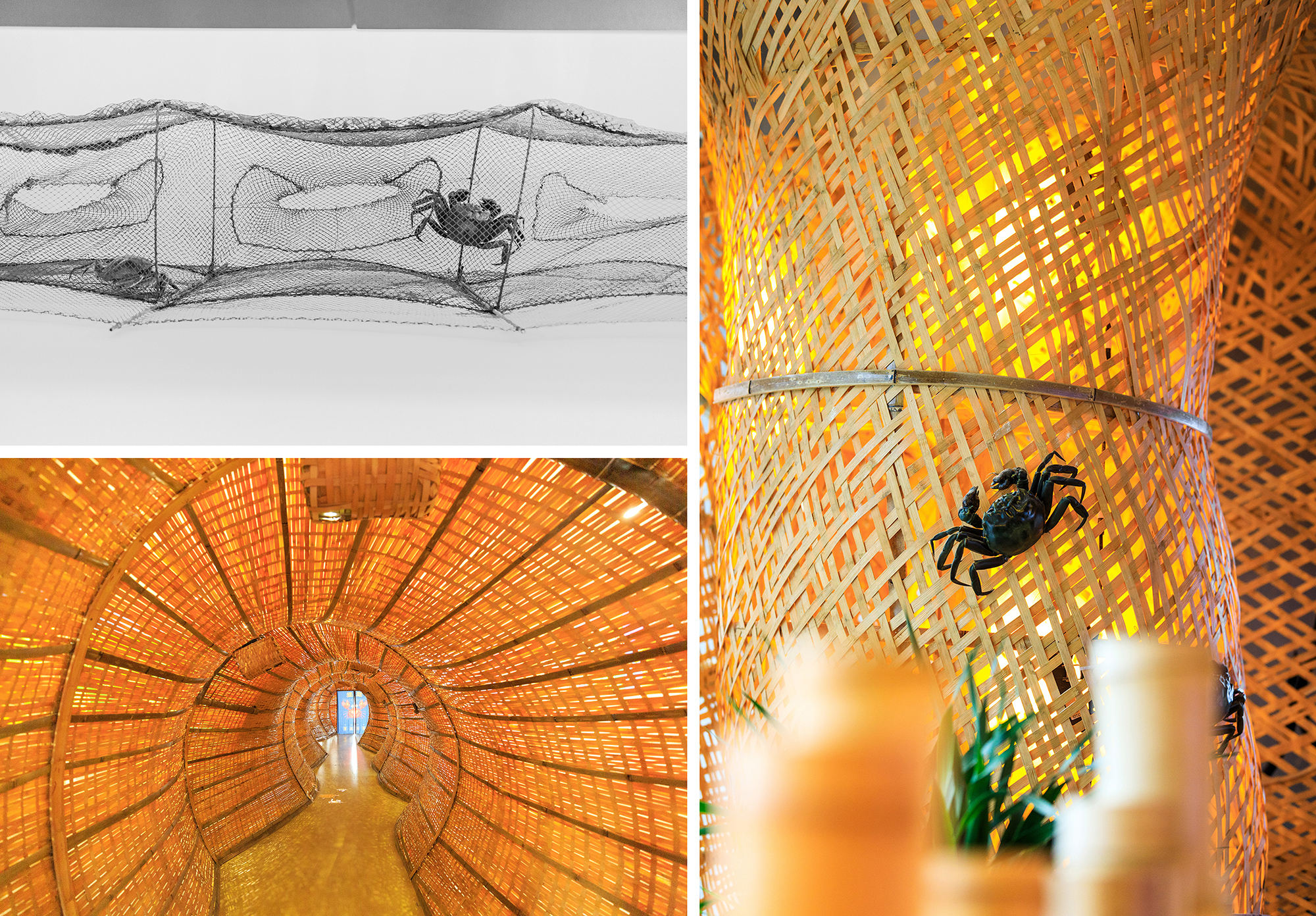 入口处,一个用竹篾编织的“蟹笼”映入眼帘,大闸蟹生活的自然生态世界即将在此揭开神秘面纱。