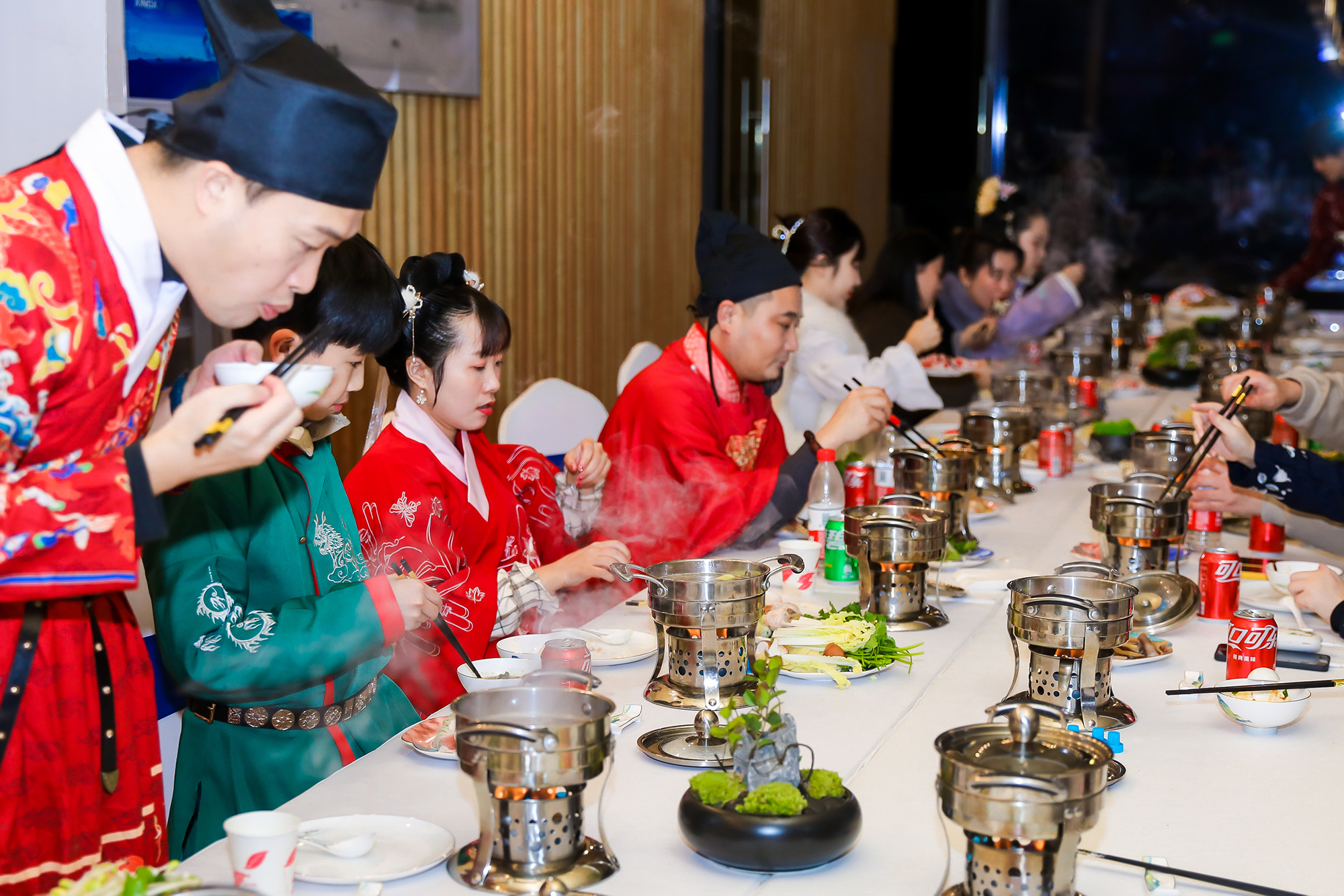 而穿着汉服,与众多好友排排坐起,人人面前一只小火锅,这场景光是想想都馋人。
