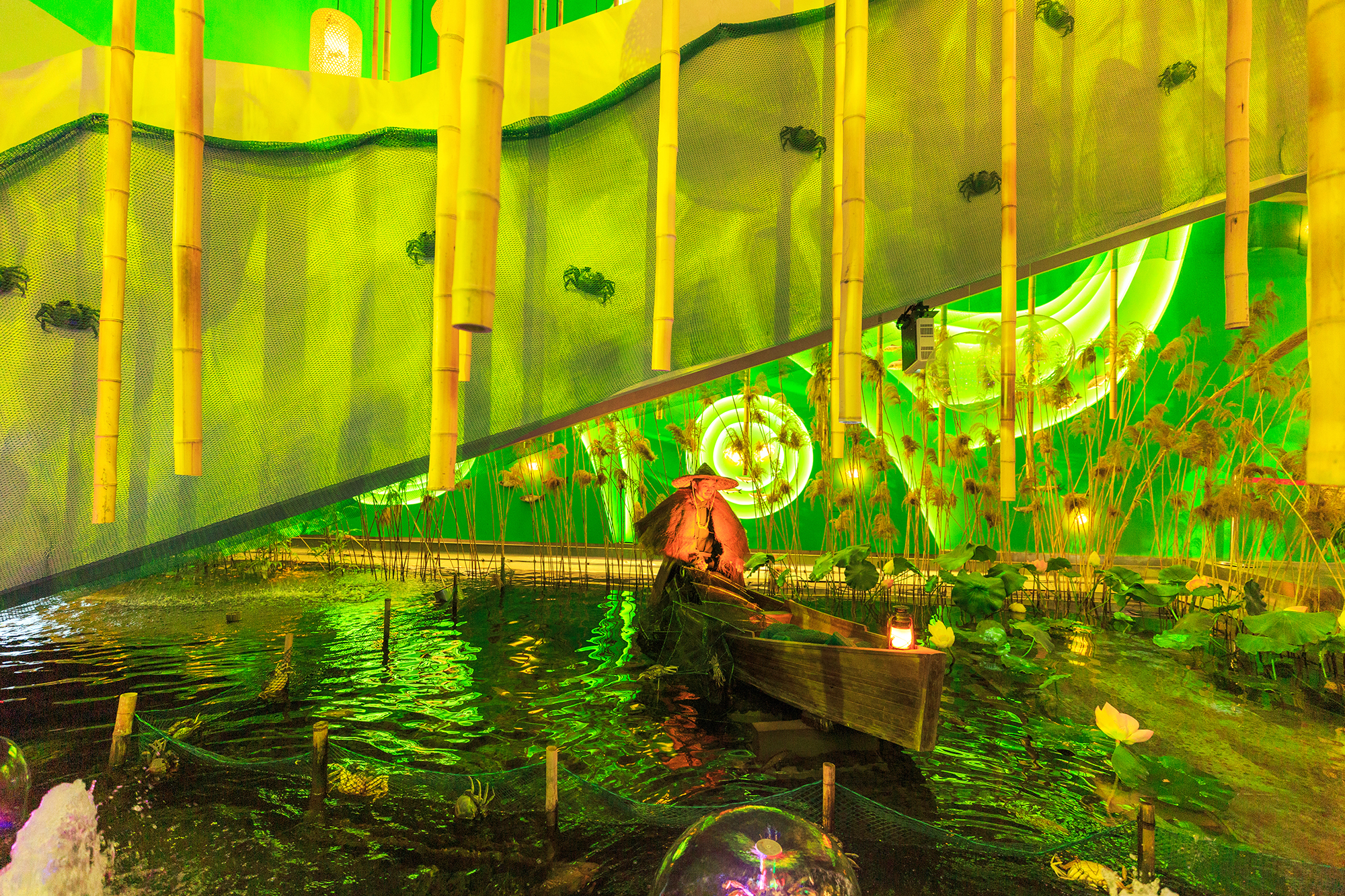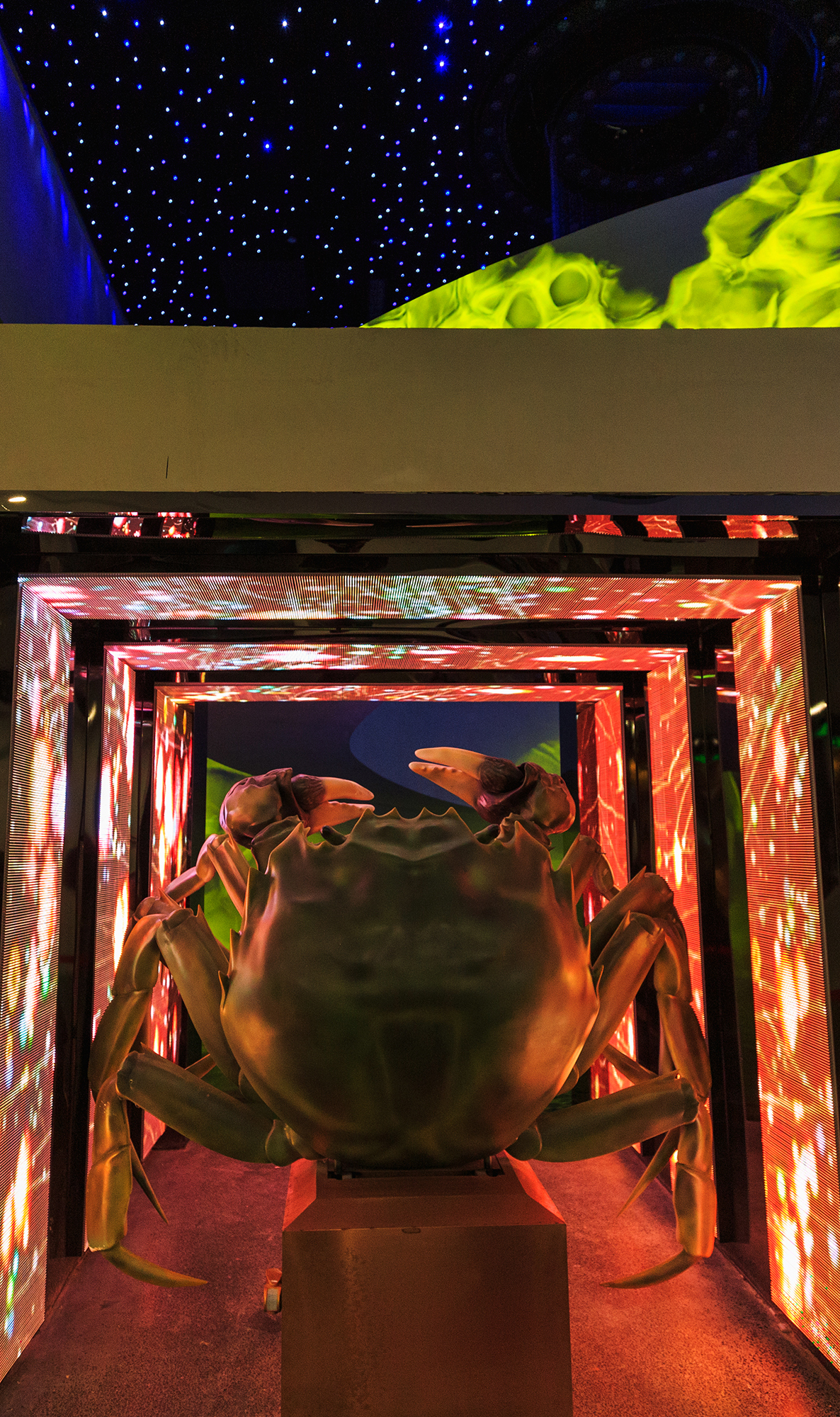 馆内还打造有“好水好蟹”光影水秀、“菊黄蟹肥”激光多媒体影像秀、“光影蟹笼”艺术装置秀、“星夜捕蟹”情景秀等多场各富特色的光影多媒体秀。
