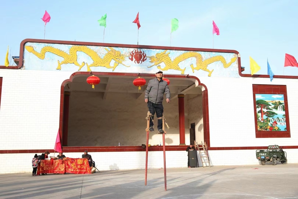 1月18日,平凉市崆峒区四十里铺镇洪岳村社火队在村文化广场排练社火节目场景。