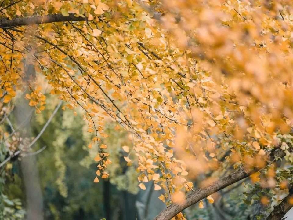 黑褐色的老枝杆隐入明黄色的叶色中